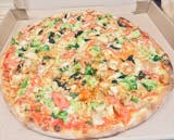 White base pizza with shrimp, clams, broccoli, garlic, olive oil, mozzarella, and a sprinkle of parmesan cheese.