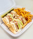Ham, cheese, bacon, lettuce, tomato, and mayo on triple-decker white toast. Served with french fries.